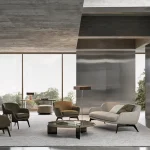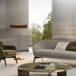The hand-finishing of the leather belt — involving the same stitching, burnishing, and edge-finishing techniques used in the production of luxury leather goods — is one of the most demanding craft operations in the Minotti production process. The result is a detail that rewards close inspection: the stitching is precise and consistent, the leather surface is free of imperfection, and the buckle or closure mechanism (where applicable) operates with the smooth precision of a fine accessory. The Canaletto Walnut or Brandy-colored cast aluminum leg options provide a base detail that matches the material quality of the belt above.