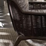 High-tenacity woven cord — the material chosen for the outdoor belt — is a technical textile used in marine and architectural applications for its resistance to UV degradation, moisture absorption, and mechanical stress. Its application to a furniture detail of this scale and precision requires the same level of craftsmanship as the leather version: the cord must be drawn to consistent tension, the pattern must be maintained precisely, and the terminations must be finished with the same quality as the rest of the piece. The stainless steel frame and solid Teak feet complete a specification appropriate for the most demanding exterior environments.