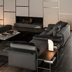 The result is a seating system capable of serving multiple programmatic requirements simultaneously: the Duvet sections invite genuine relaxation and extended occupation, while the Tailor elements provide upright seating appropriate for conversation and formal reception. For hotel lobbies, executive lounges, and private members' clubs, this dual register makes the Freeman system exceptionally versatile. The extruded aluminum base in glossy Bronze finish elevates the system visually, giving it a precision that references contemporary Italian product design rather than conventional upholstered furniture.