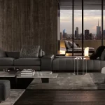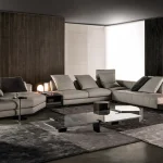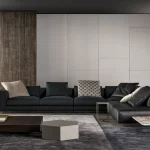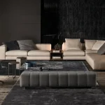 The Freeman Duvet Sofa represents Minotti's most direct engagement with the vocabulary of fashion and tailoring applied to furniture. The 'Duvet' sections — named for the channeled, quilted aesthetic of their upholstery — achieve their soft, rounded profile through a construction method that involves precision-stitched seams under tension, creating a surface texture that reads as both sculptural and tactile. The 'Tailor' elements, by contrast, are defined by clean horizontal lines and taut upholstery, providing formal counterpoints that prevent the system from reading as purely informal.