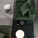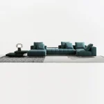 The suspended base frame — a continuous perimeter of polished metal that runs beneath the entire configuration — is both a functional and aesthetic element. Functionally, it provides a stable structural platform for the modular components. Aesthetically, it creates the impression that the seating mass floats above the floor, reducing the visual weight of even large-scale configurations. The integrated aluminum trays, upholstered in leather to match or complement the main upholstery, are a practical accessory that has become increasingly important in contract environments where specifiers require integrated solutions for drinks, devices, and personal effects.