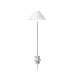 The table version is available with either a round base or a pin mounting for desk installation. The cone-shaped shade in spun aluminum delivers glare-free downward-directed light via an integrated LED; a small opening at the top of the shade allows a gentle uplight for ambient presence. The switch and dimmer are located on the base or pin. Available in matte black and matte white. The design language is severe and architectural — it reads as a piece of graphic industrial design as much as a lamp.