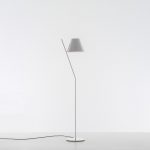 La Petite Floor walks a careful line between presence and restraint. An archetypal lampshade is balanced on a tilted wire stem that leans at an angle, creating the impression of a lamp caught mid-bow — or a dancer in an asymmetric pose. There is no symmetry in its design, but there is order: a subtle harmony of elements disassembled, held in equilibrium at the boundary between light and dark.