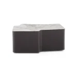The construction of these tables is especially complex and combines modern technology with cabinetmaking tradition. The contoured internal structure is in MDF, sheathed in larch veneered plywood, which is then milled along the curved edges. The larch base in prefinished Dove Grey and Licorice lacquer finish is paired with flush-set tops made of materials designed to create unexpected contrasts. The class of Calacatta marble and the depth of pâte de verre marry well with the texture and feel of the wood.