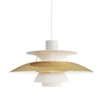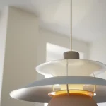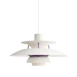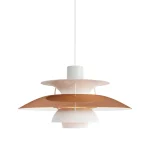 The PH 5 is available in a wide range of finishes including classic white, multi-colour (a tribute to Henningsen’s original palette), copper, and various lacquered options. A small red inner shade and blue auxiliary shade correct the colour temperature of the light, adding warmth and preventing the blue cast typical of early fluorescent sources. The proportions and shade geometry have remained essentially unchanged since 1958. The current version ships with an integrated LED source. It is among the most specified pendant lamps in Scandinavian and international residential and hospitality design.