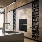 System: Architectural kitchen system with curved and rectilinear elements. Fronts: Lacquered with embossed texture, natural wood veneer, or Fenix NTM surfaces. Worktops: Ceramic, natural marble, granite, or engineered quartz. Distinctive Feature: Curved peninsula and open shelving modules with integrated LED illumination. Internal Organisation: Servo-drive assisted wall units, full-extension drawers. Handles: Integrated J-profile handleless or slim metal bar. Backsplash: Coordinated tall boiserie panelling system. Origin: Made in Italy by Poliform.