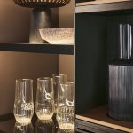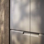 The fronts are available in lacquered finishes with a distinctive embossed texture, natural wood veneers with a brushed or smooth finish, and Fenix NTM — the soft-touch, self-healing nanotech surface. These material options allow Shape to range from warm, organic compositions centred on timber and stone, to cooler, more graphic schemes built around lacquer and ceramic.