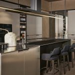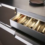Functional sophistication matches the visual ambition. Servo-drive-assisted wall units open at a touch, full-extension drawer systems feature custom dividers, and integrated appliance housing keeps the visual line unbroken. Worktop choices span natural marble, granite, ceramic, and engineered quartz — all cut and finished to the curved geometries that define the system.