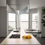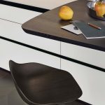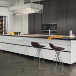 The ultra-thin door creates a visual lightness that transforms the kitchen into a composition of floating planes rather than a collection of boxes. When fronts are closed, the kitchen presents an almost perfectly flat, monolithic surface; when open, the precision-engineered concealed hinges and soft-close mechanisms reveal deep, beautifully organised interiors.
