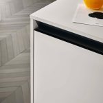 Material options are carefully curated to complement the system's minimalist character. Fronts are available in lacquered finishes (matt and gloss), natural wood veneers, and glass — each mounted to the concealed aluminium frame that gives the 12mm profile its structural integrity. The completely handleless push-pull opening system reinforces the uninterrupted surface plane, while an optional recessed aluminium grip channel provides a tactile alternative.