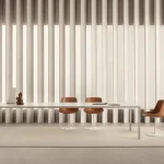 T-Table by Giulio Manzoni for MDF Italia takes its name from the T-form of its base — a structural and aesthetic statement that creates a table of strong geometric identity beneath the glass or lacquered top.