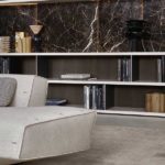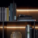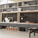 System: Modular wall-mounted or freestanding shelving. Upright material: Anodized aluminium or lacquered steel. Shelves: Wood veneer, lacquered MDF, or glass. Fully configurable. Origin: Italy.